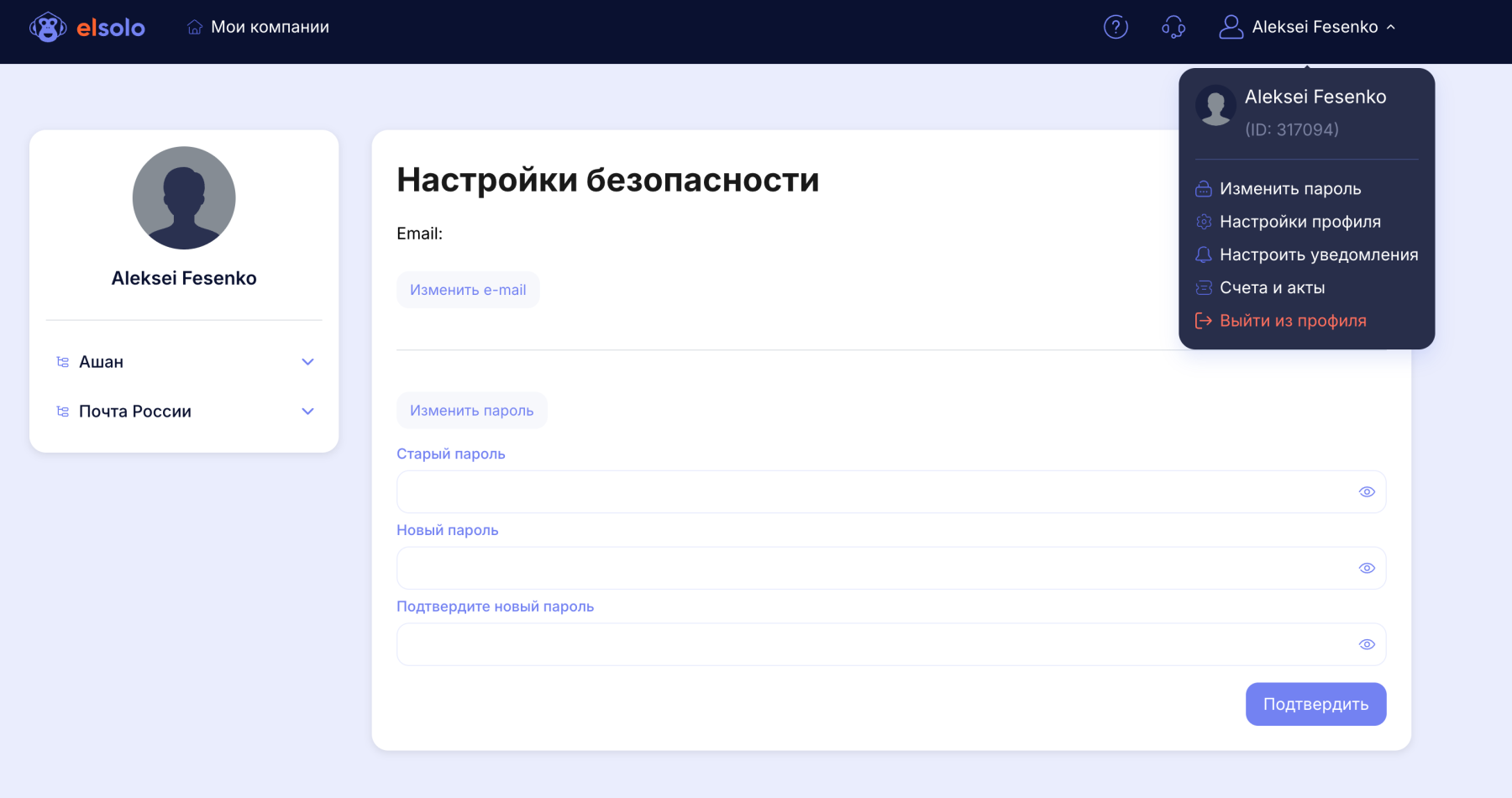 Раздел настроек находится в правой части личного кабинета — в меню пользователя. В нём доступен пункт «Изменить пароль».